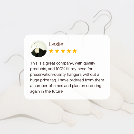 One 12", one 15" and one 17" polypropylene "shaper" hanger with chrome swivel hook. Each hanger is padded using acid-free, museum-quality materials including polyethylene padding and 100% polyester, needlepunched batting. Each hanger is double-wrapped in 100% cotton stockinette.