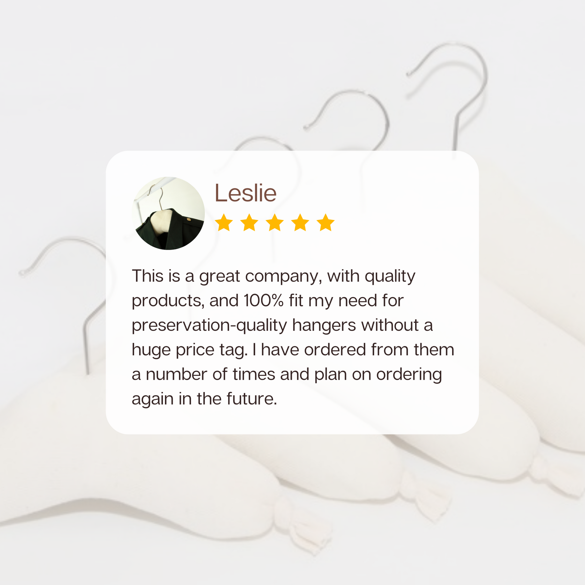 One 12", one 15" and one 17" polypropylene "shaper" hanger with chrome swivel hook. Each hanger is padded using acid-free, museum-quality materials including polyethylene padding and 100% polyester, needlepunched batting. Each hanger is double-wrapped in 100% cotton stockinette.