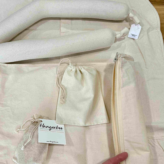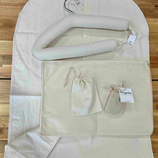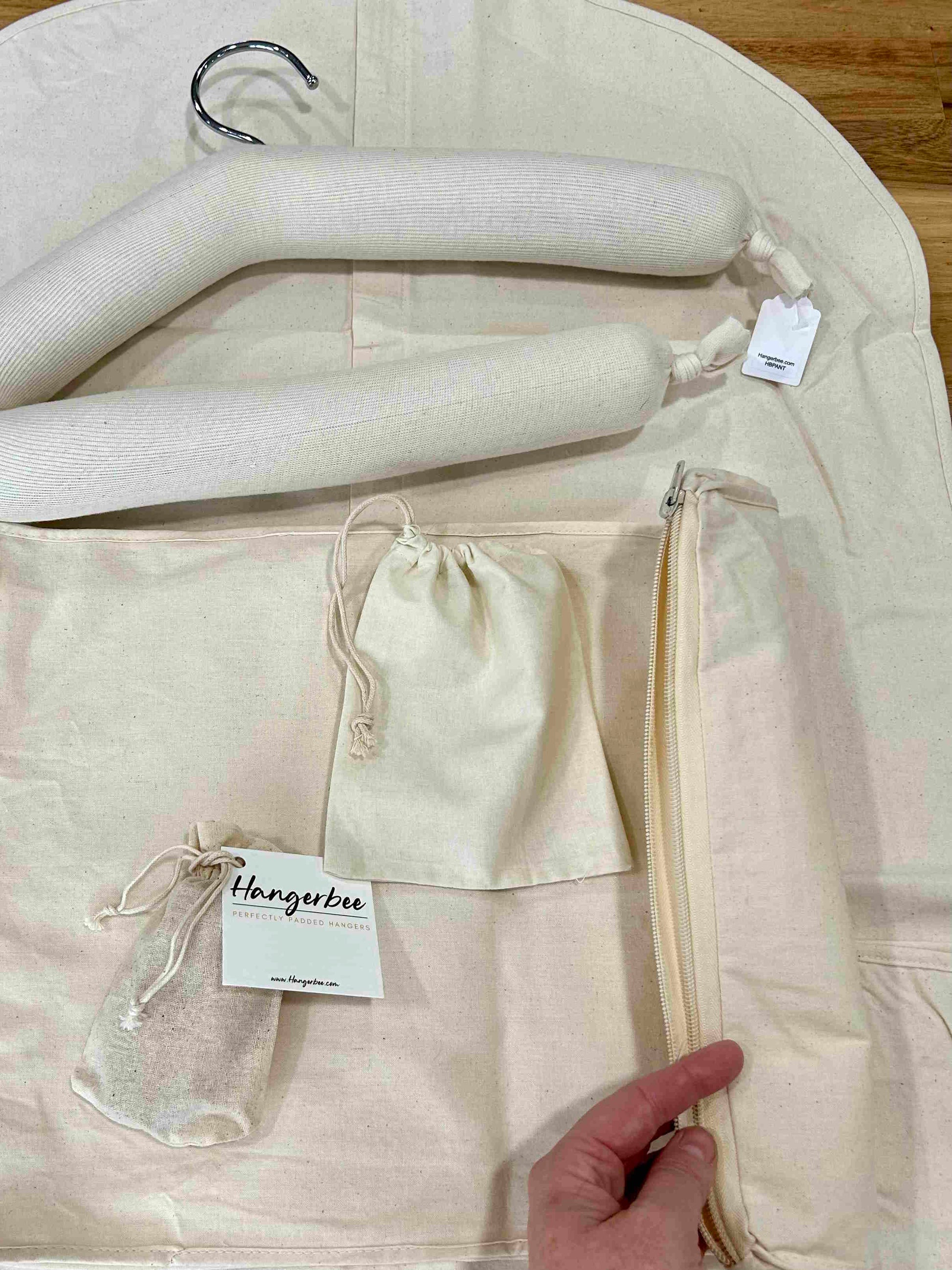 1 Large Muslin Accessory bag with zipper measuring 18” x 12” x 1”, perfect for a pair of shoes, sweater, or large accessories.